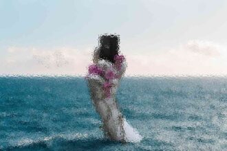 Abstract art, collage with female portrait and mountains, generative ai